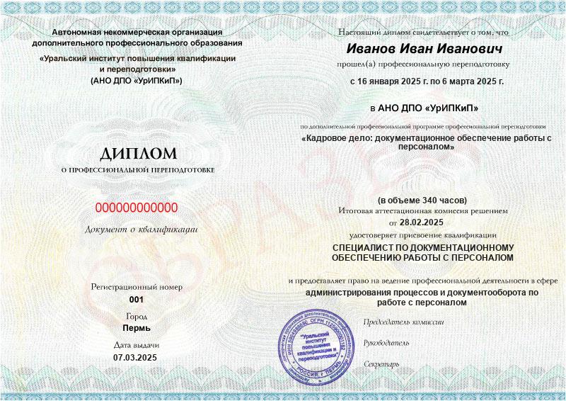 Да, дипломы и удостоверения оформляются в соответствии с действующим законодательством РФ. Документы печатаются на специальных бланках, заверяются печатью АНО ДПО «УрИПКиП».