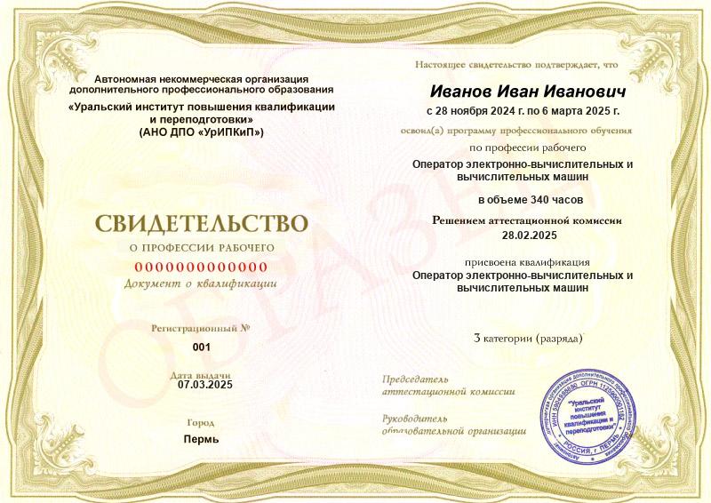 - Квалификация: Оператор электронно-вычислительных и вычислительных машин