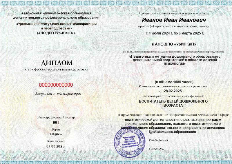 Да, дипломы и удостоверения оформляются в соответствии с действующим законодательством РФ. Документы печатаются на специальных бланках, заверяются печатью АНО ДПО «УрИПКиП».